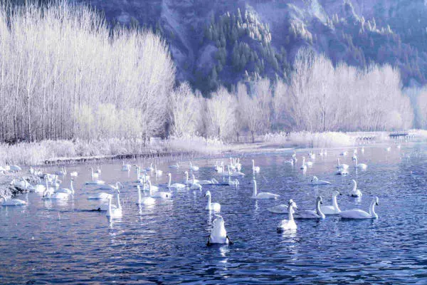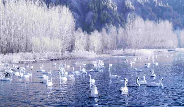 Sáng: Quý khách ăn sáng tại khách sạn sau đó đoàn khởi hành đi suối Thiên – Swan Lake (gồm xe điện tham quan 2 giờ). Đây là nơi thiên nga tụ họp và cư trú nhiều nhất ở Y Lê (Yi Ning). Mùa đông là thời điểm đẹp nhất của Swan Lake. Mặt hồ xanh biếc giữa không gian tuyết trắng, hơi nước bốc lên tạo màn sương mỏng như một bức tranh thủy mặc. Hàng trăm thiên nga bay về trú đông, nổi bật trên nền tuyết, tạo nên cảnh tượng vô cùng thanh bình và hiếm thấy. Xe điện len qua rừng cây phủ trắng, ngắm thiên nga ở cự ly gần – trải nghiệm mùa đông rất đặc trưng của Yili.
